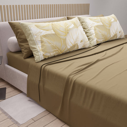 Lenzuola in Cotone, Completo Letto con Federe in Stampa Digitale Tropical Tortora-Oro