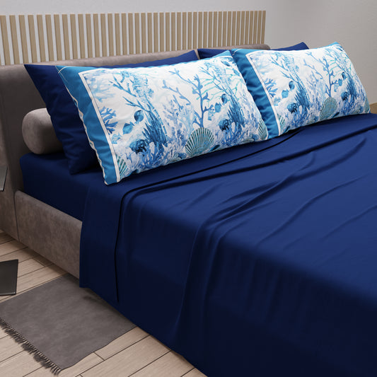 Lenzuola in Cotone, Completo Letto con Federe in Stampa Digitale Corallo Blu