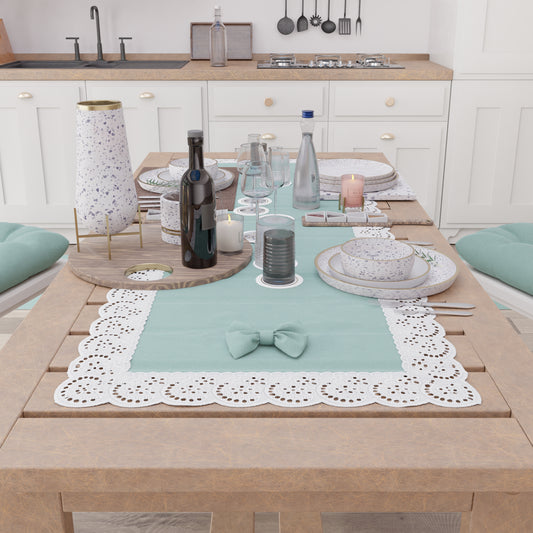 Runner da Tavolo Elegante Shabby Chic con Pizzo e Fiocchi Verde Acqua