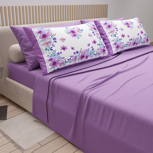 Lenzuola in Cotone, Completo Letto con Federe in Stampa Digitale Floreale Viola