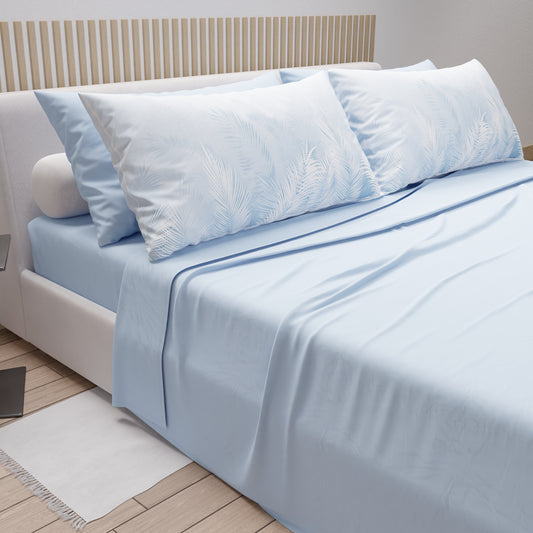 Lenzuola in Cotone, Completo Letto con Federe in Stampa Digitale Foglia Celeste