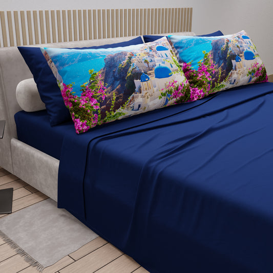 Lenzuola in Cotone, Completo Letto con Federe in Stampa Digitale, Santorini - Grecia