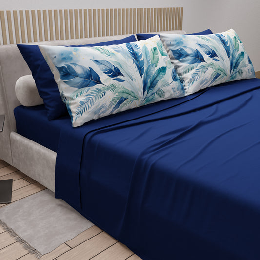 Lenzuola in Cotone, Completo Letto con Federe in Stampa Digitale Palmwater Blu