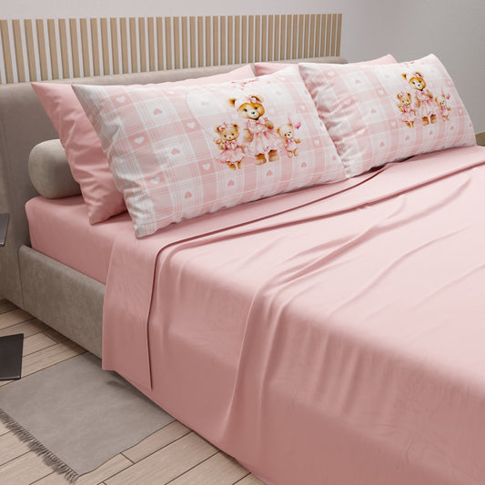 Lenzuola in Cotone, Completo Letto con Federe in Stampa Digitale Teddy Love Rosa