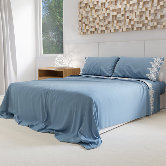 Lenzuola Percalle con Pizzo, Lenzuola Matrimoniali Cotone Azzurro