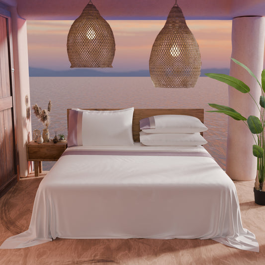 Lenzuola Matrimoniali in Puro Cotone Percalle con Doppia Balza in Raso - Cipria