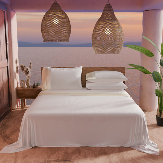 Lenzuola Matrimoniali in Puro Cotone Percalle con Doppia Balza in Raso - Panna