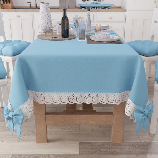 Tovaglia da Tavola Shabby Chic Copritavolo con Pizzo e Fiocchi Celeste