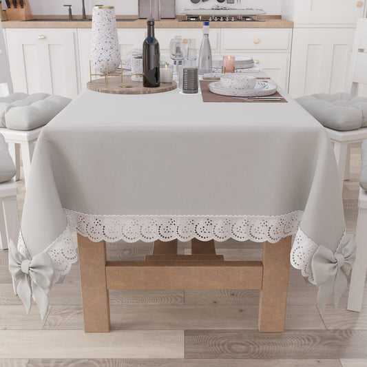 Tovaglia da Tavola Shabby Chic Copritavolo con Pizzo e Fiocchi Grigio Chiaro