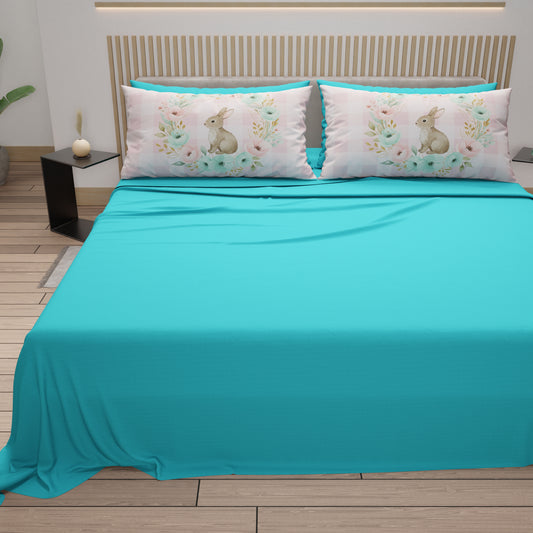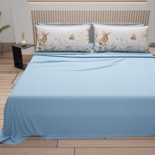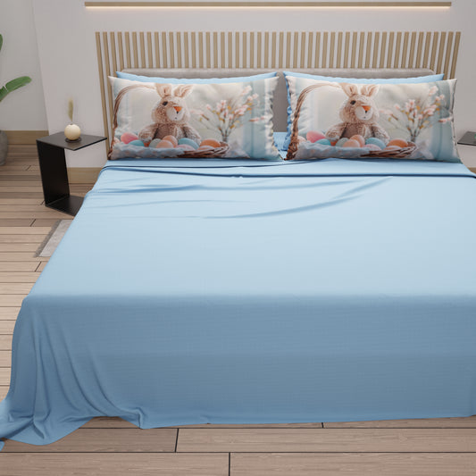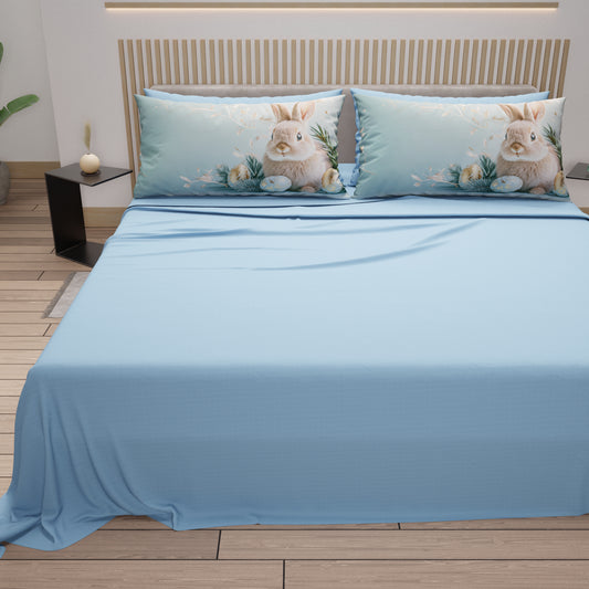 Lenzuola Pasqua in Cotone, Completo Letto con Federe in Stampa Digitale, Bunny Garden Azzurro