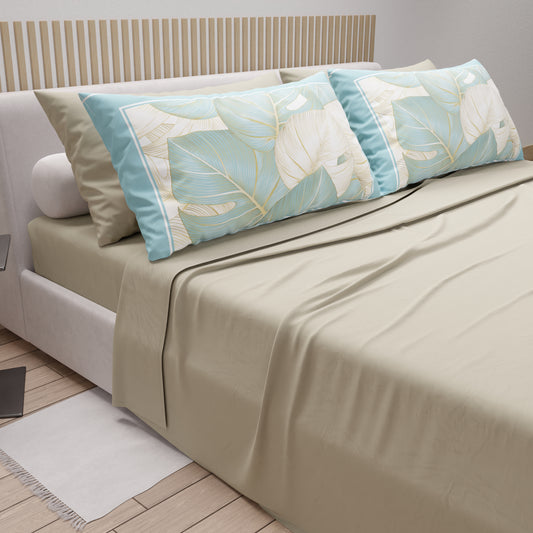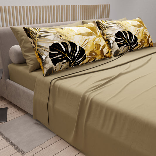 Cotton Sheets, Bed Set with Tropical Powder-Gold Digital Print Pillowcases