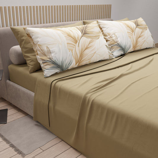 Cotton Sheets, Bed Set with Pillowcases in Tropical Taupe-Gold Digital Print
