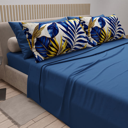 Cotton Sheets, Bed Set with Tropical Light Blue-Gold Digital Print Pillowcases