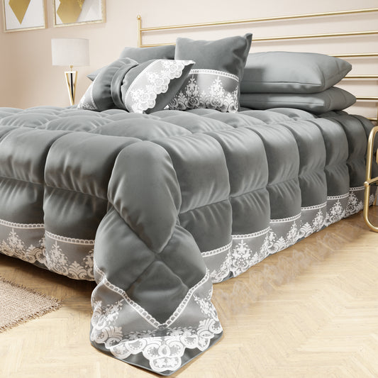 Trapunta Invernale in Morbido e Caldo Velluto e Balza con Pizzo Rebrodè Grigio Scuro By Sissy