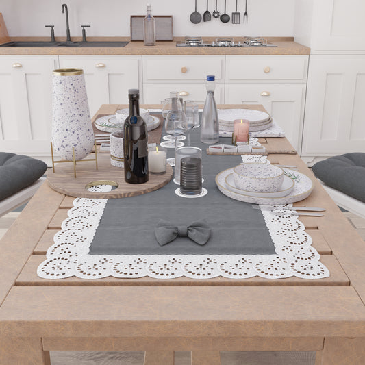 Chemin de table élégant Shabby Chic avec dentelle et nœuds gris foncé
