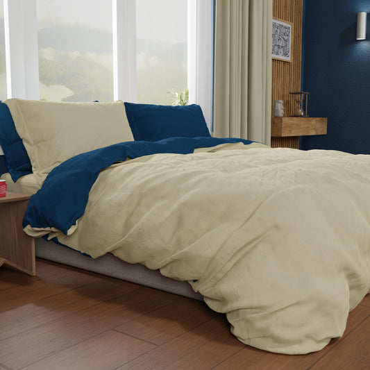 Housse de couette double, housse de couette et taies d'oreiller, bleu nuit/taupe