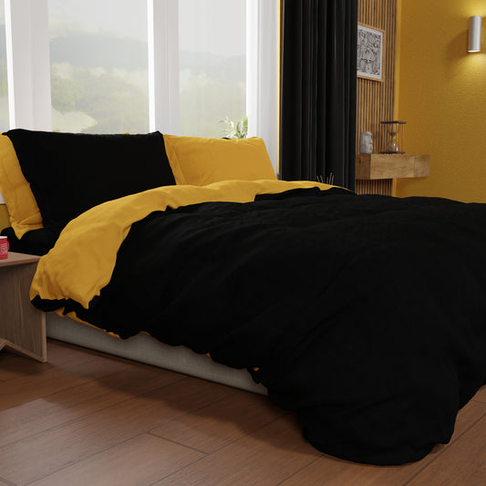 Housse de couette double, housse de couette et taies d'oreiller, jaune ocre/noir