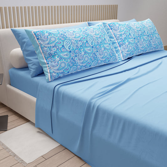 Draps en coton, parure de lit avec taies d'oreiller à impression numérique Paisley bleu clair