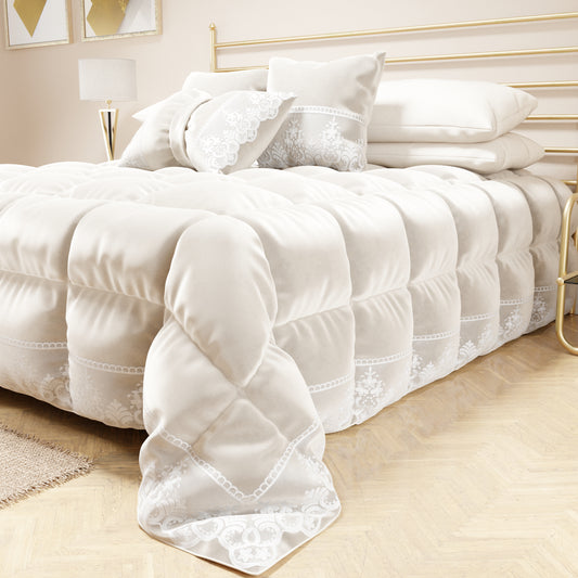 Trapunta Invernale in Morbido e Caldo Velluto e Balza con Pizzo Rebrodè Panna By Sissy