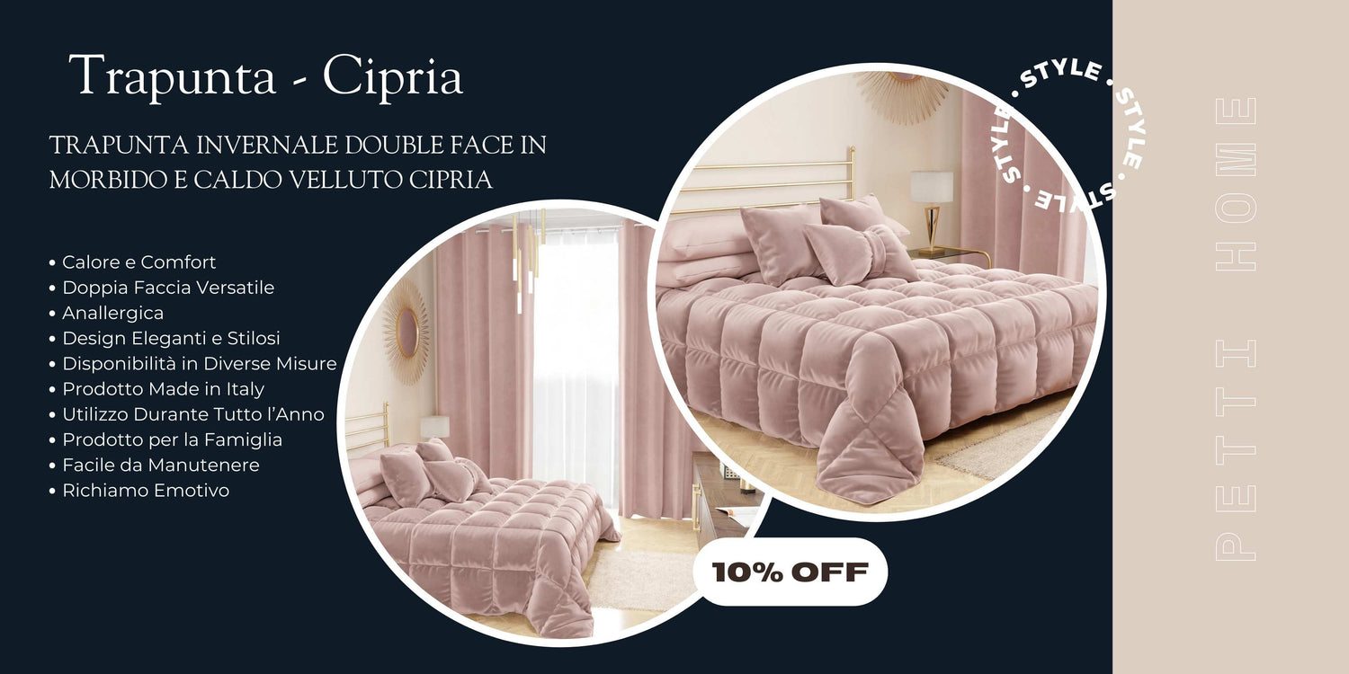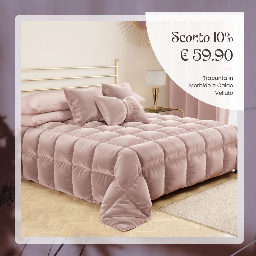 La funzione principale della trapunta è garantire calore durante le fredde notti invernali. L'imbottitura in poliestere anallergico da 300 gr/mq assicura un sonno accogliente e confortevole.